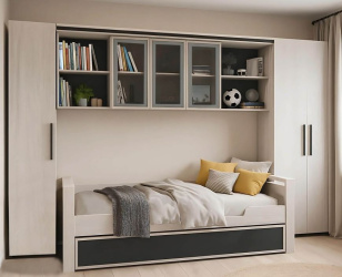 Представленные комплекты детской мебели включают кровати, которые дополнительно могут превращаться в диван. Многие из них с нижним местом для хранения постельного белья, несезонного гардероба. Есть открытые, закрытые и комбинированные полки. Большой выбор шкафов для одежды, игрушек. Рабочее место оформляется в виде стола, стационарных и мобильных тумбочек. На выбор прикроватные тумбы. Пользуются спросом комбинированные варианты кровати и стола, или кровати с игровой зоной на первом этаже.
