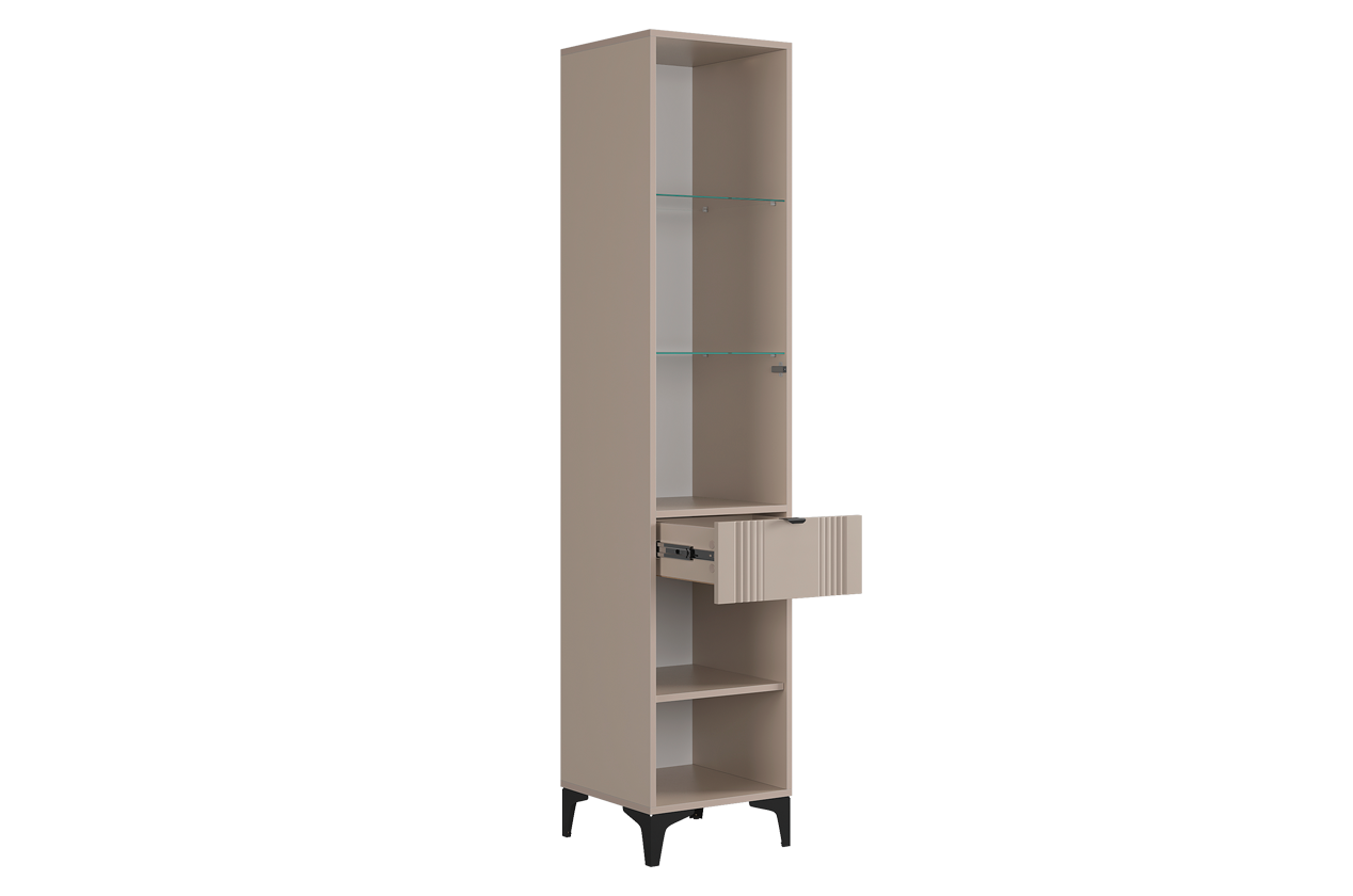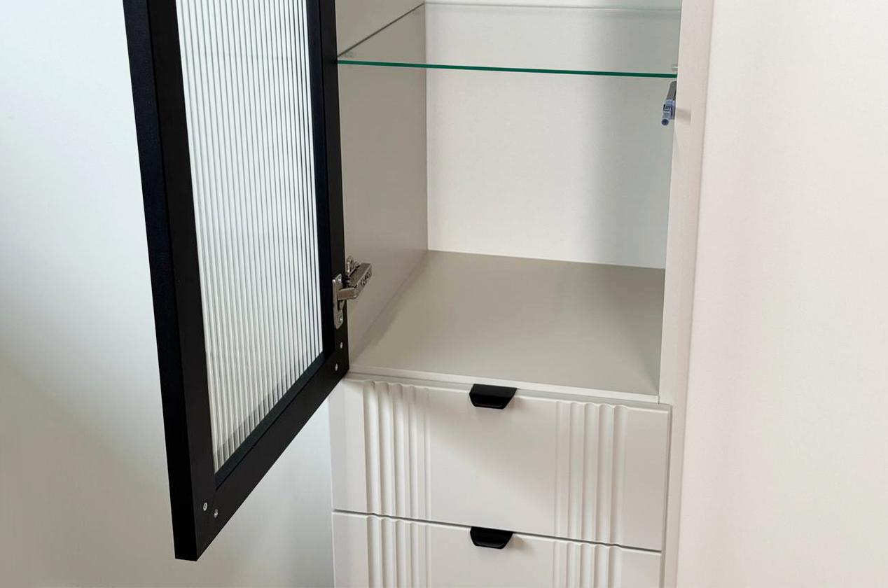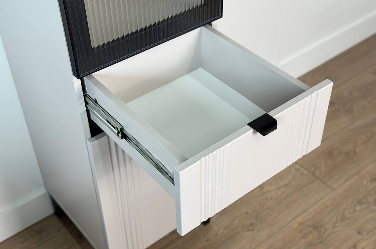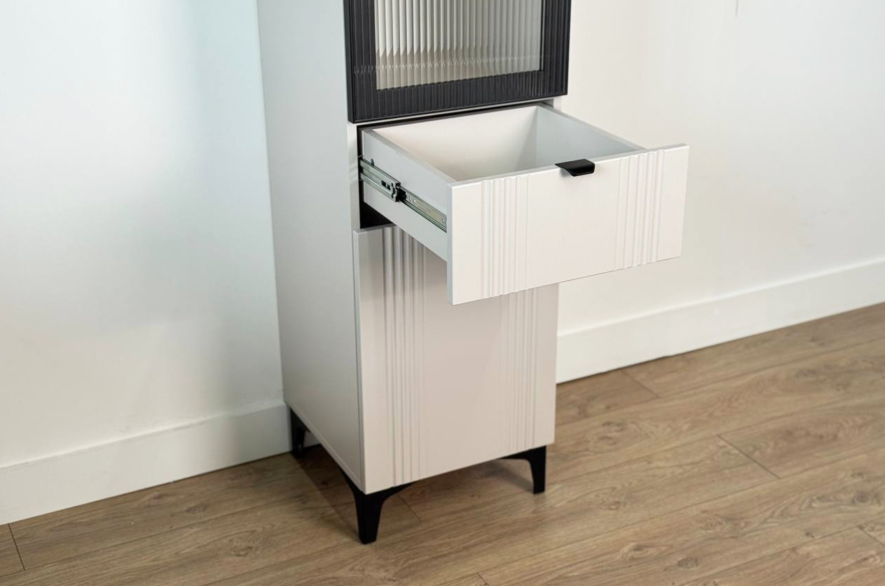 • • Внутреннее наполнение: Полки за стеклянной и глухой дверцами, а также выкатной ящик для эффективного использования пространства.