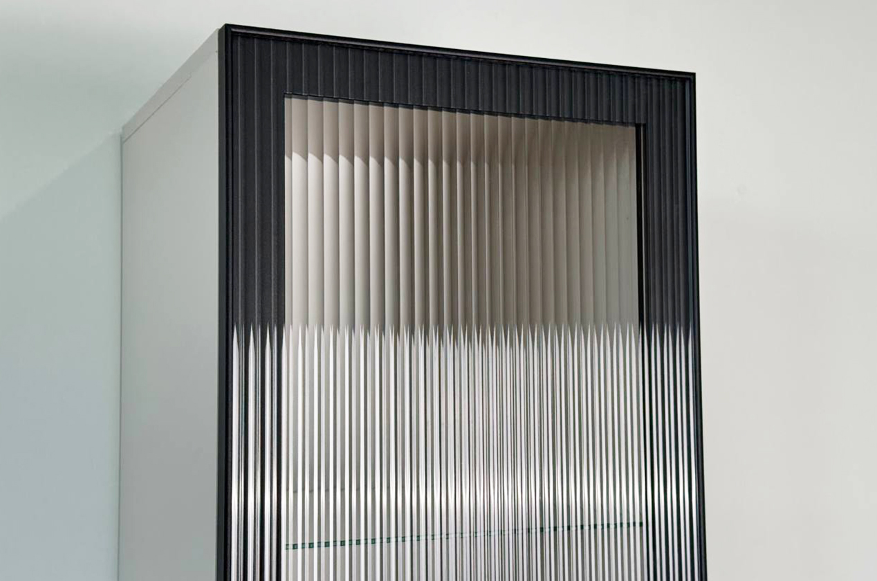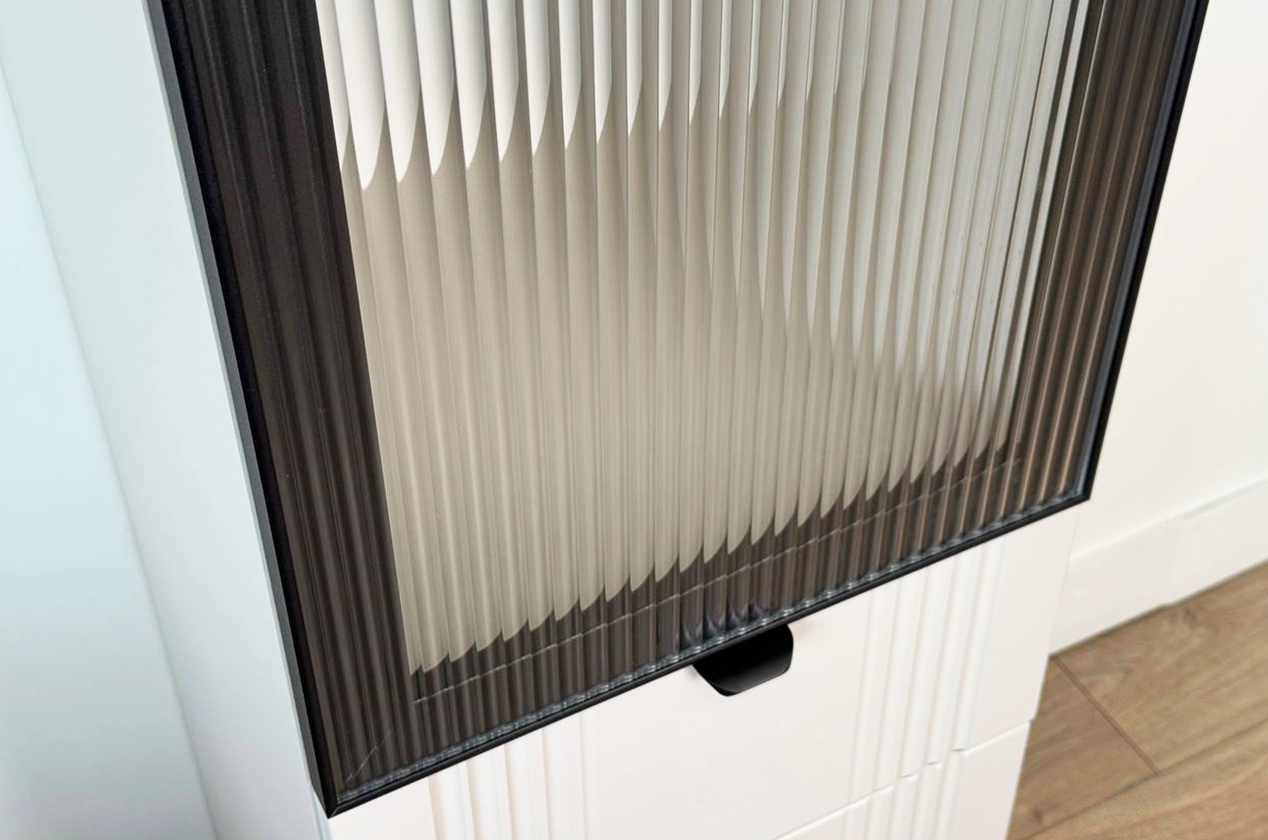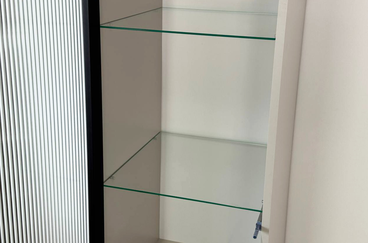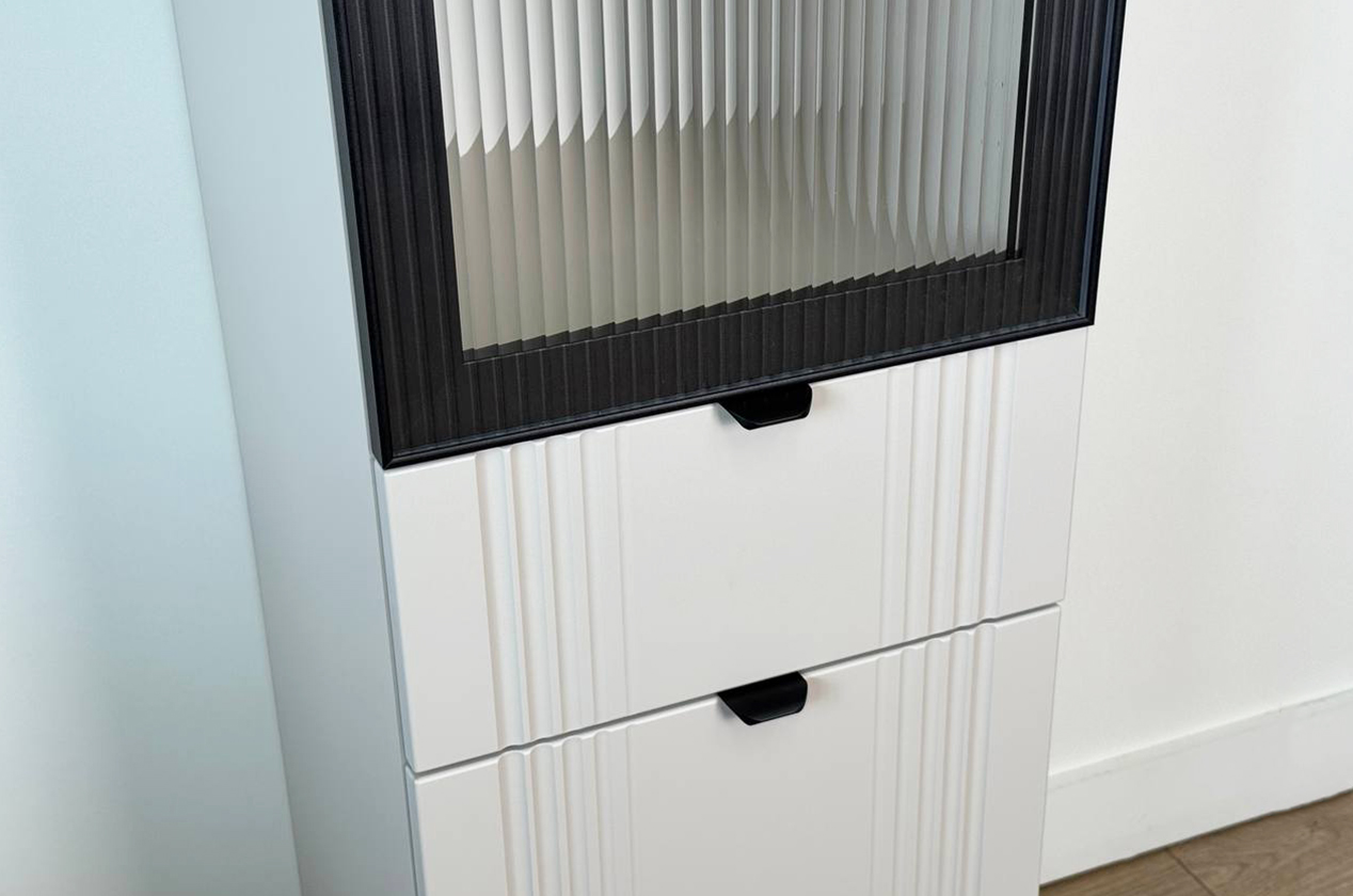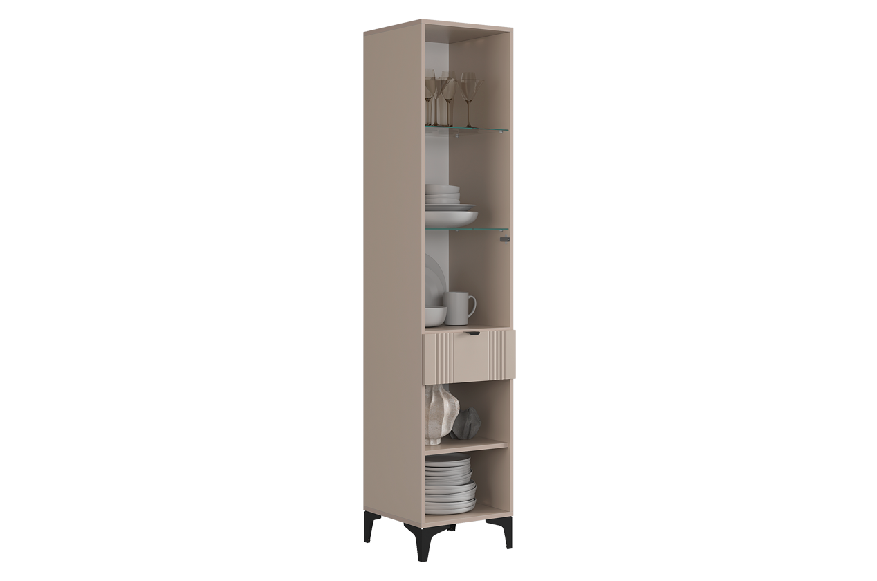 • • Внутреннее наполнение: Полки за стеклянной и глухой дверцами, а также выкатной ящик для эффективного использования пространства.