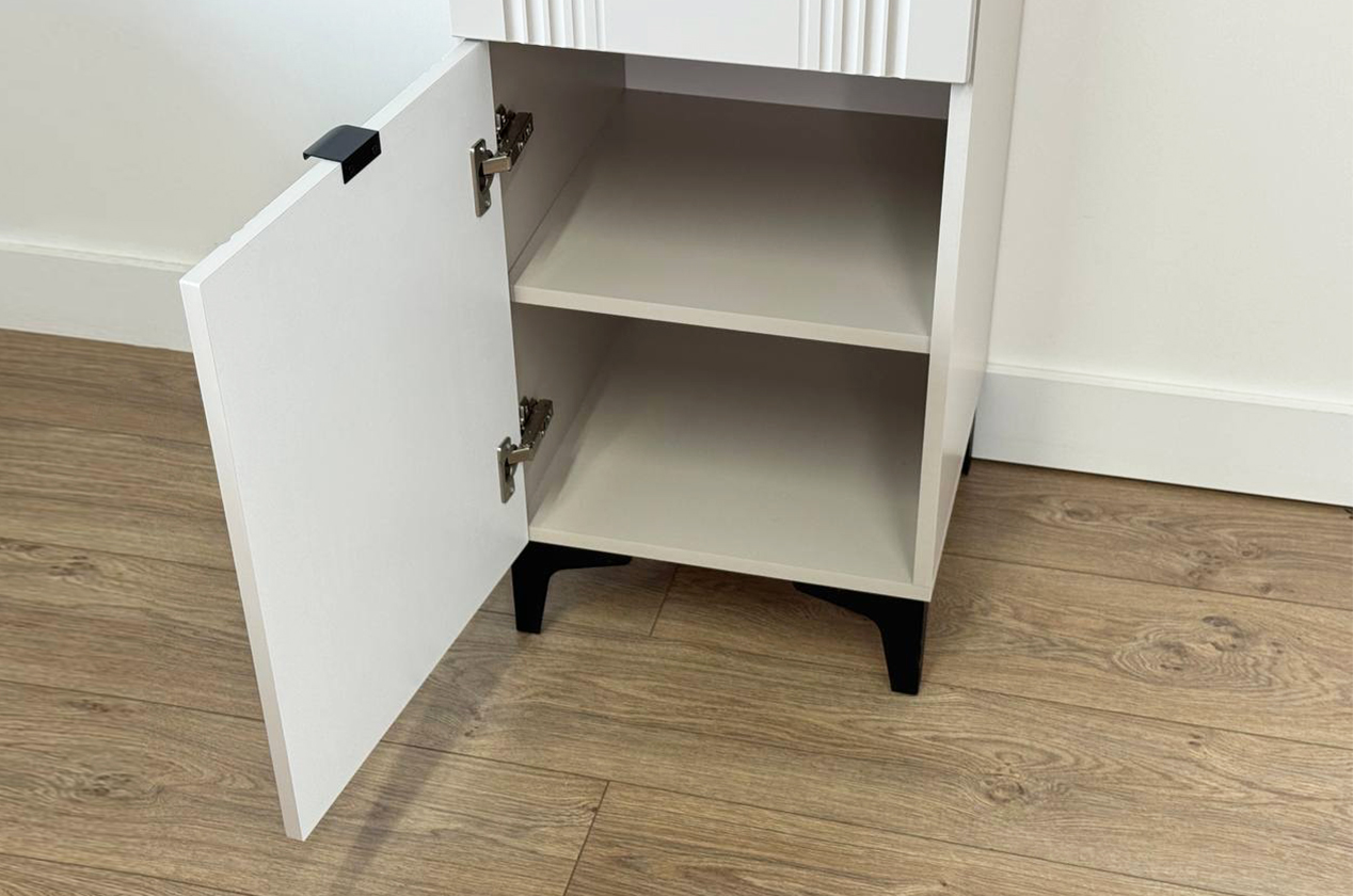 • • Материалы: Корпус — ЛДСП (прочность, долговечность), фасад — МДФ с покрытием ПВХ (защита от повреждений, эстетика).