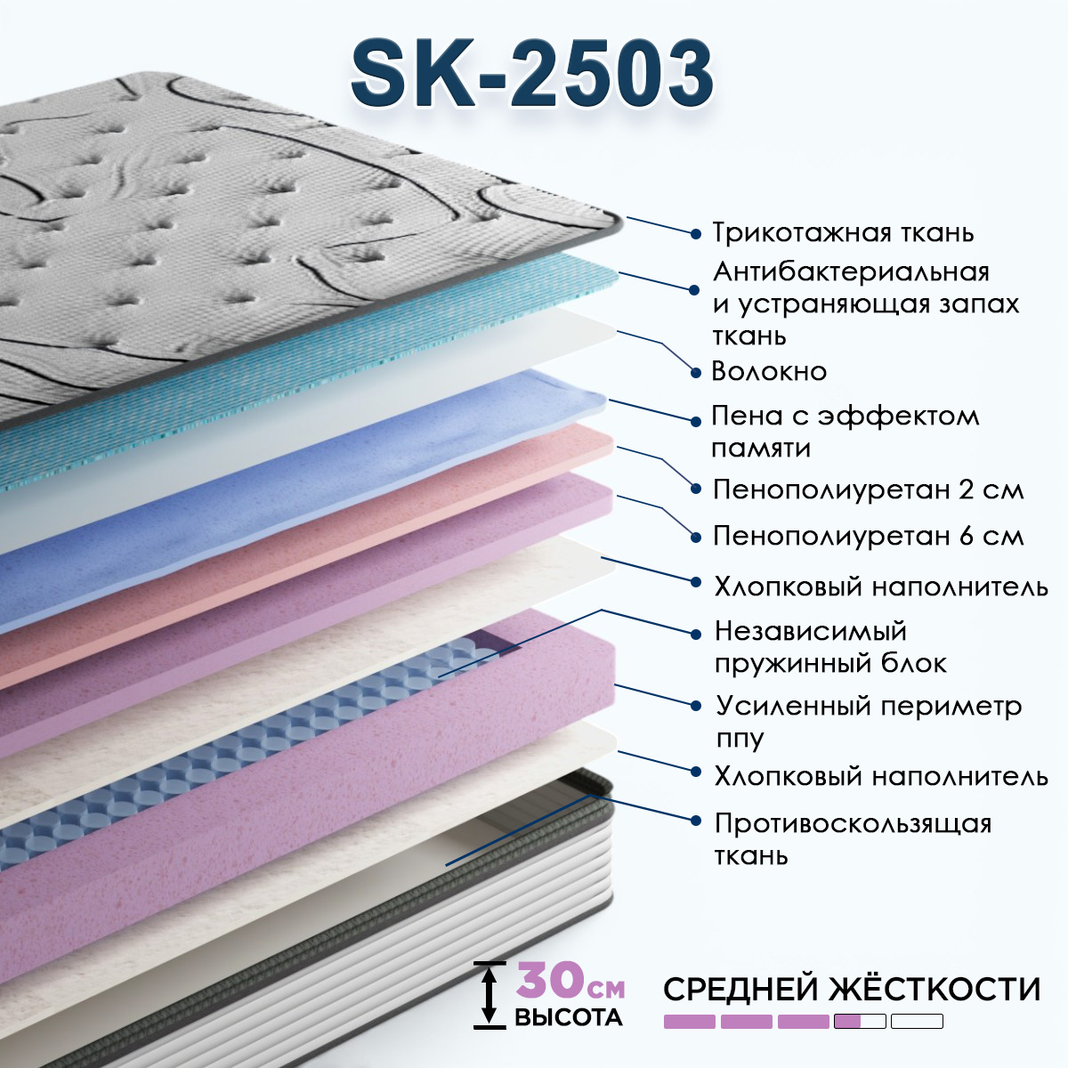 Матрас средней жесткости SK-2503 — это инновационное решение для безупречно здорового и комфортного сна. Он сочетает в себе передовые ортопедические технологии, уникальные гигиенические свойства и усиленную конструкцию периметра. Этот матрас создан для тех, кто ценит не только качественный отдых, но и чистоту, свежесть и долговечность спального места.