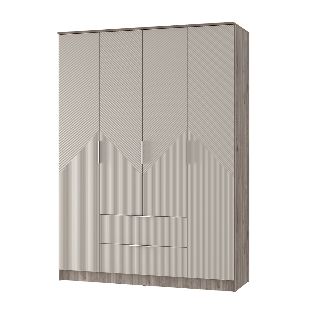 Четырехстворчатый шкаф «Эмилия» ШК-11 воплощает лучшие тенденции современного мебельного дизайна. Нежная цветовая гамма «дуб смоки» и «айриш» в сочетании со стильной фрезеровкой фасадов наполняет пространство светом и воздухом. Модель продумана до мелочей: боковые полки для аккуратного хранения, центральные секции для повседневной одежды на плечиках и два вместительных нижних ящика для обуви или постельного белья.
