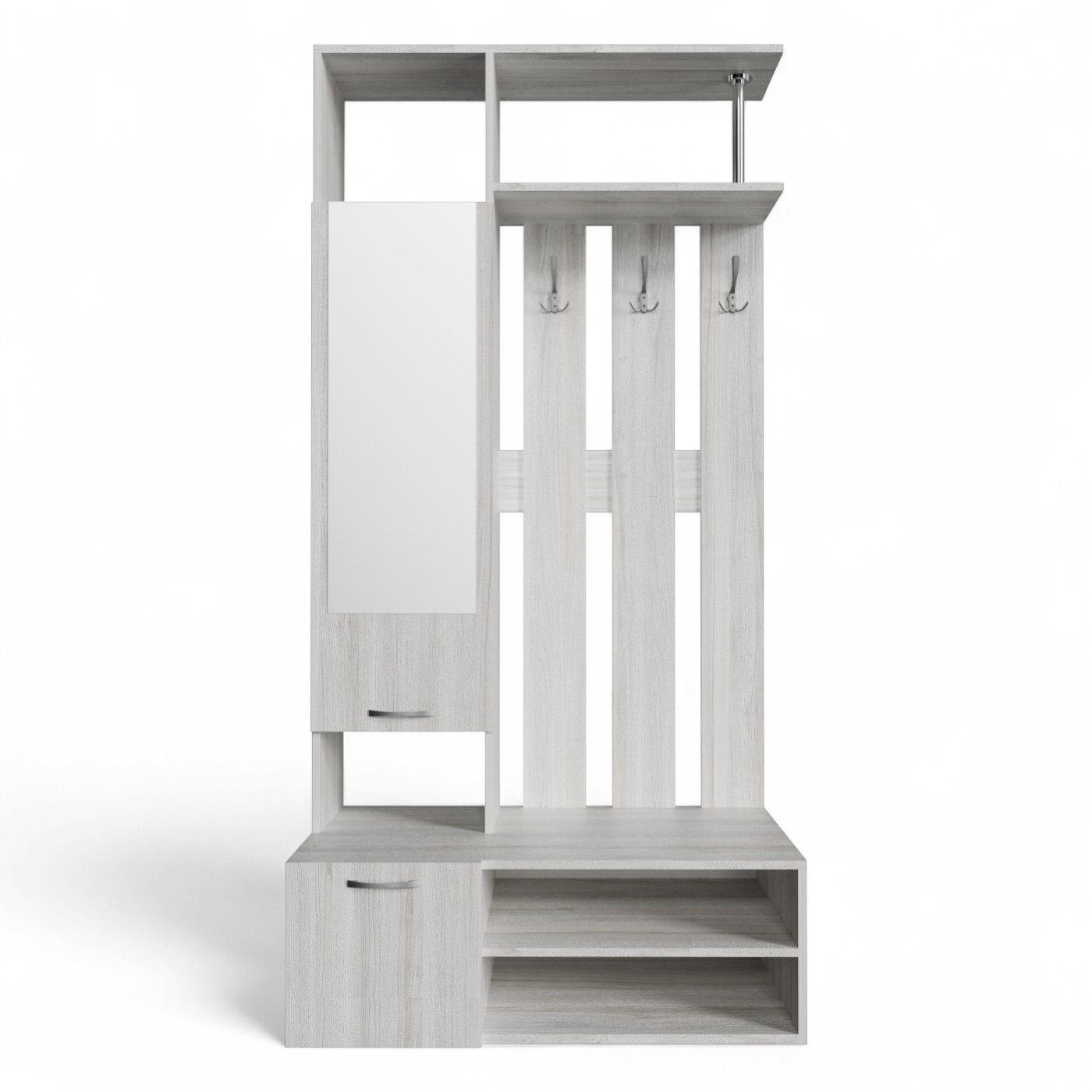 Организуйте пространство у входа с помощью практичной прихожей "БН-208". Модель предлагает полный набор для хранения, сочетая закрытые и открытые решения.