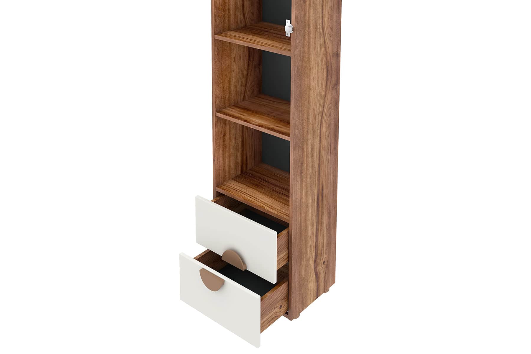 Однодверный шкаф с двумя ящиками из модульной коллекции «Тризиль» (448×346×2051 мм) — это идеальное сочетание элегантного дизайна и функциональности. Благодаря компактным размерам он легко впишется даже в небольшие помещения. Фасады из ЛДСП и МДФ отличаются прочностью и устойчивостью к износу, а сочное сочетание оттенков «Зеленый камень» и «Белый» придаст интерьеру современный и свежий вид.